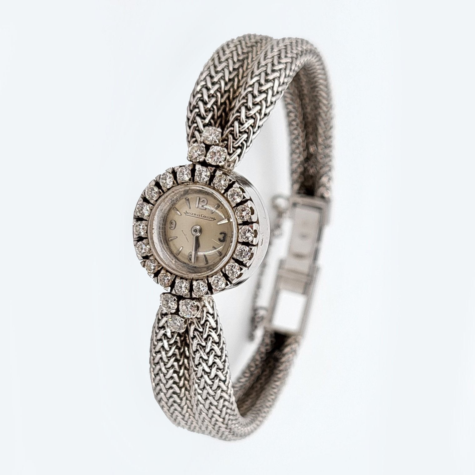 Bracelet-montre dame en or blanc 18 ct JAEGER-LeCOULTRE mécanique sertie de 24 brillants +/- 0.72 ct (chaînette de sûreté) - 34.3 g brut (16.5 cm)
