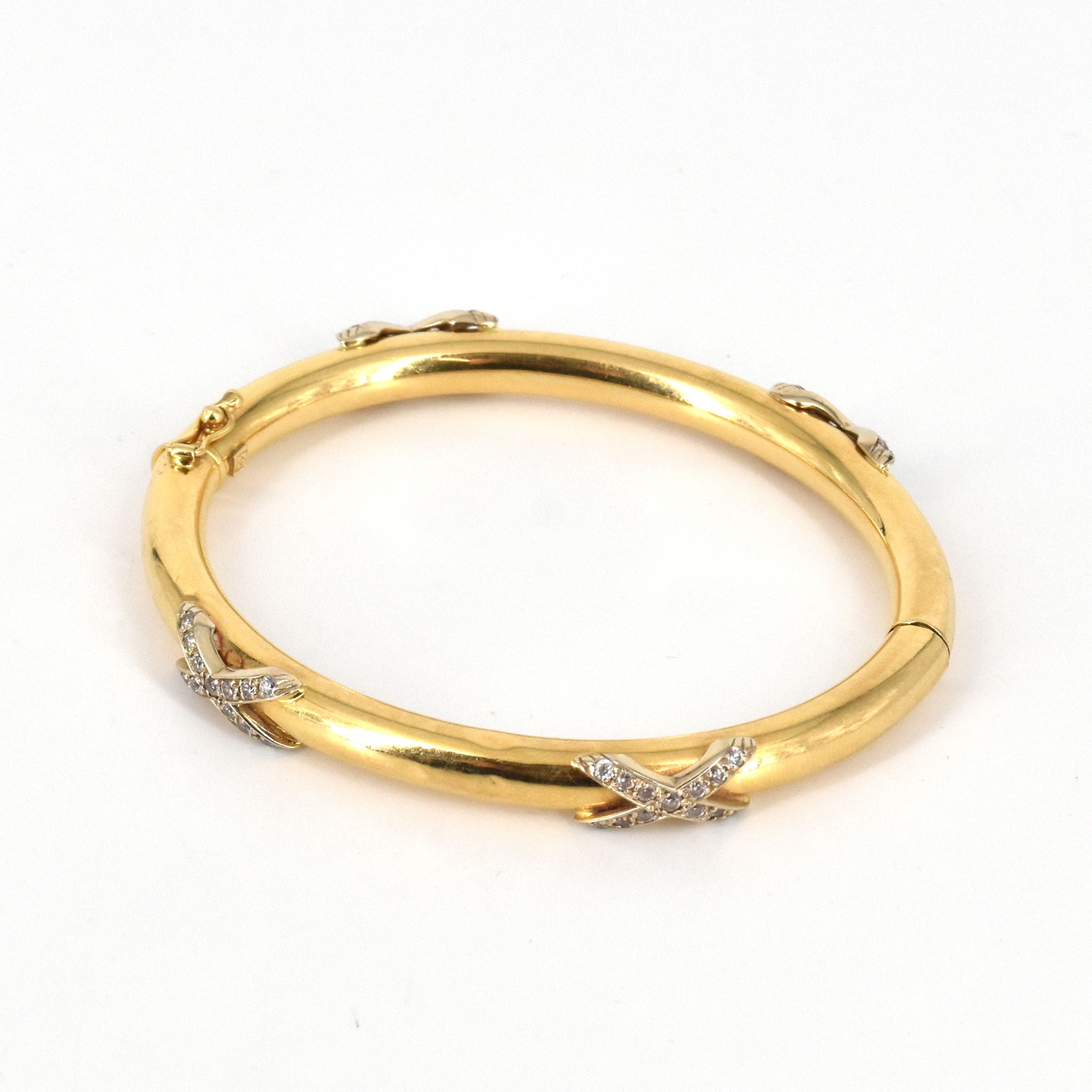Bracelet rigide en or jaune et blanc 18 ct (pierres fausses, bosselé) - 15.6 g brut (6 x 5 cm)