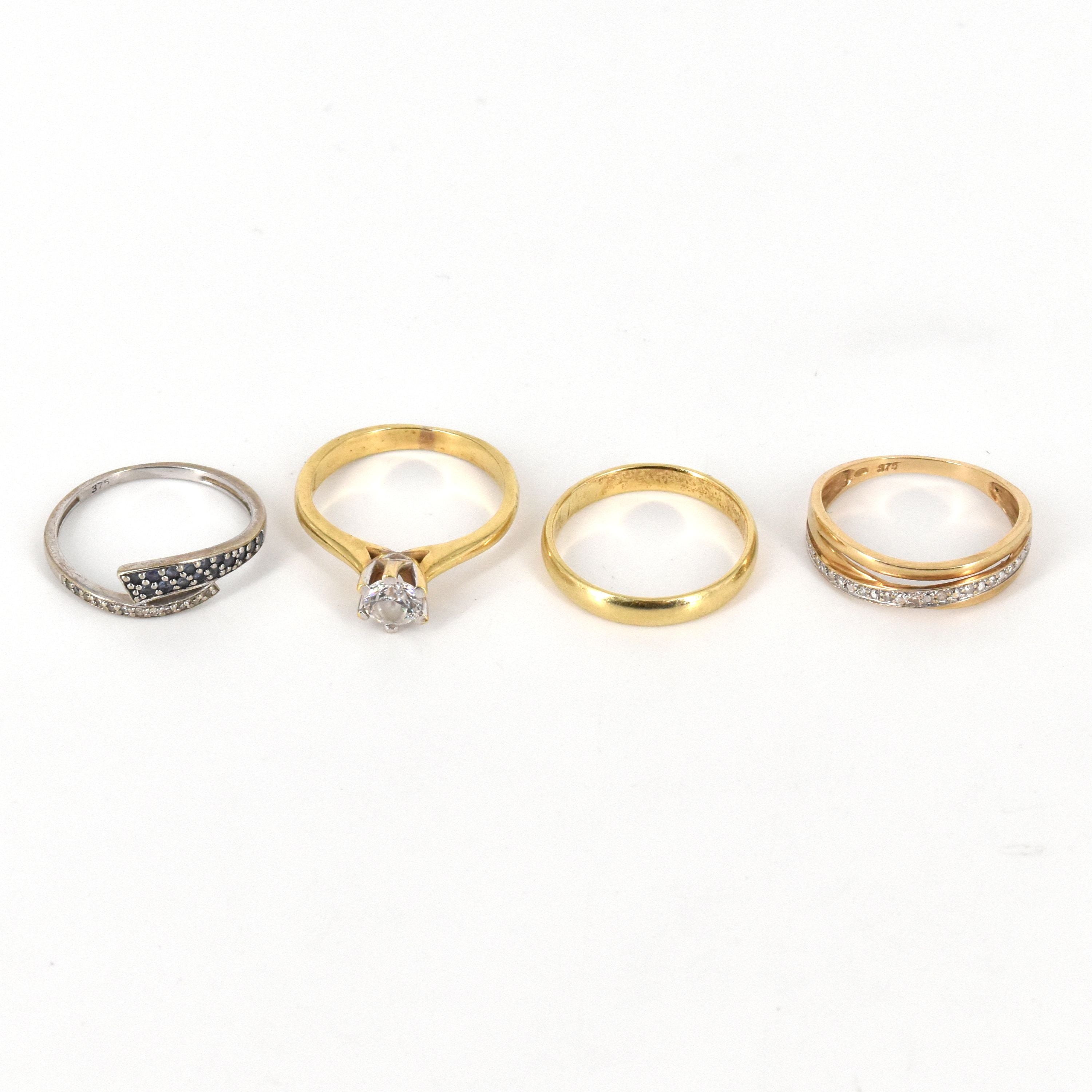 Alliance en or jaune 14 ct - 2.2 g (Taille: 52) Bague en or jaune 18 ct (pierre fausse) - 3.7 g (Taille: 52) 2 bagues en or jaune et blanc serties de 22 diamants taille 8/8 +/- 0.20 ct (pierres de couleur) - 2.8 g brut (Tailles:52 & 53)