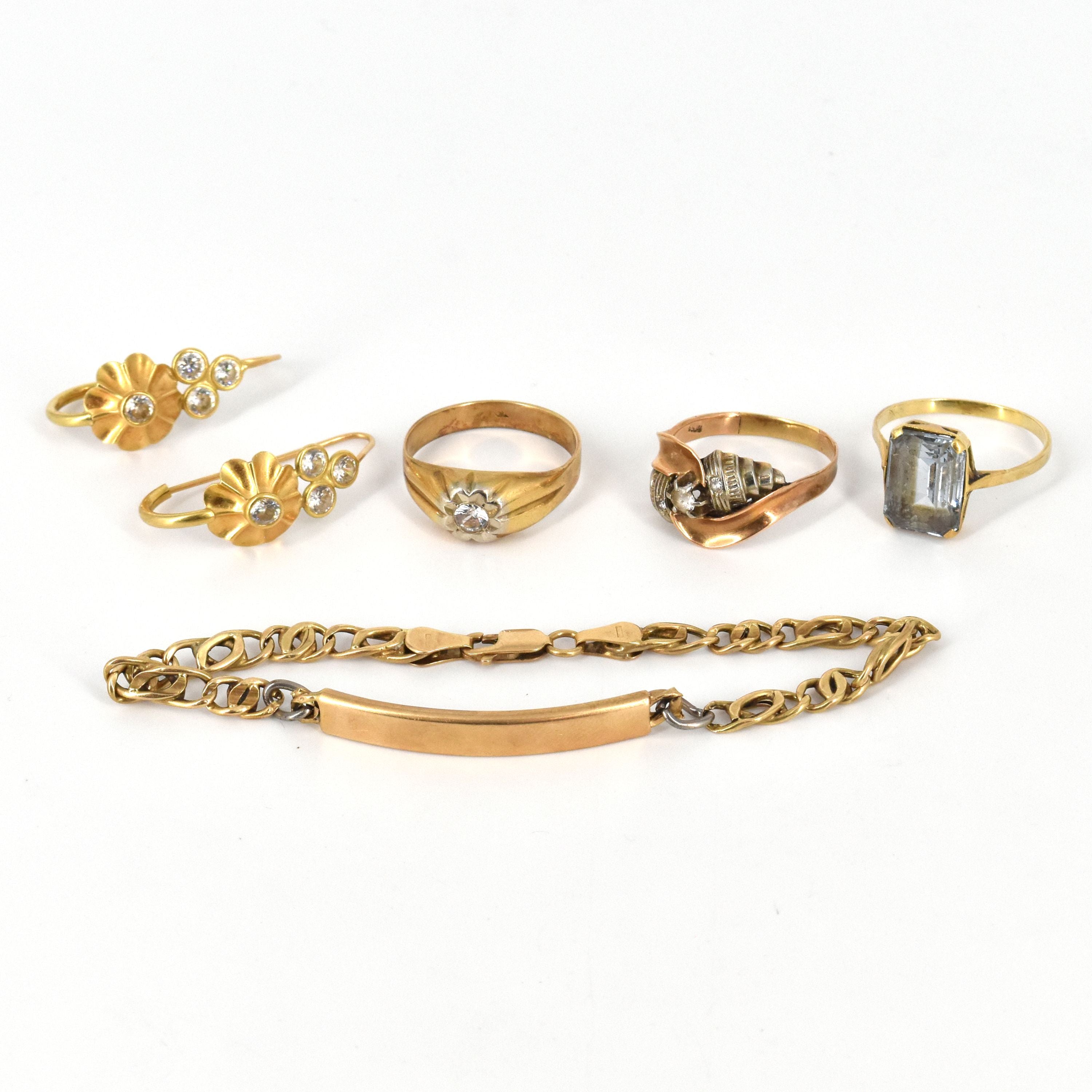 3 bagues, gourmette et 2 boucles d'oreilles en or jaune et blanc 18 ct (pierres fausses, pierres de couleur, bosselés) - 29.1 g brut (Tailles: 67.5, 65.5 & 69) (21.5 cm)