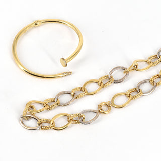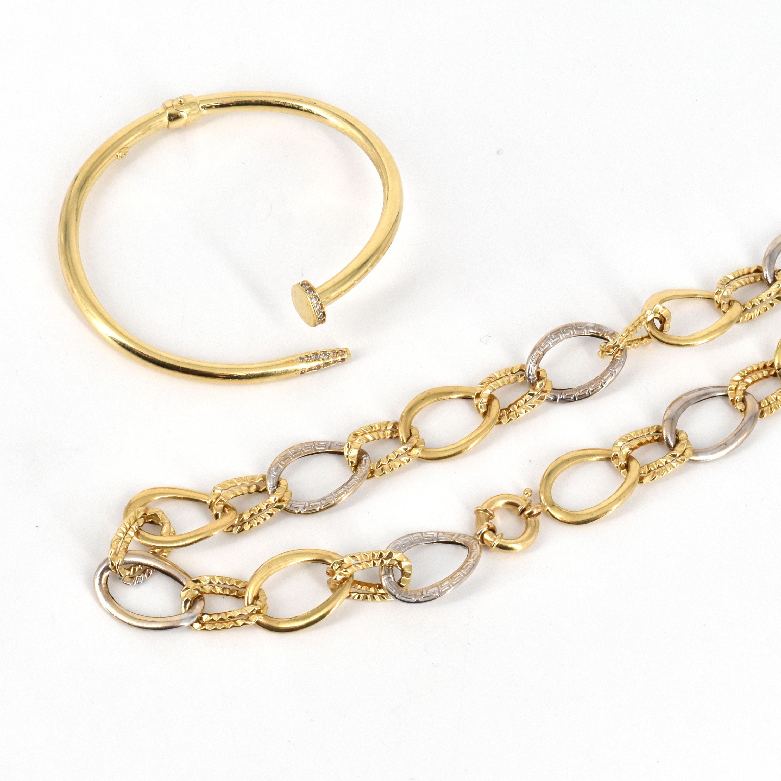 Collier et bracelet rigide en or jaune et blanc 14 ct (pierres fausses) - 25.1 g brut (44 cm) (6 x 5 cm)