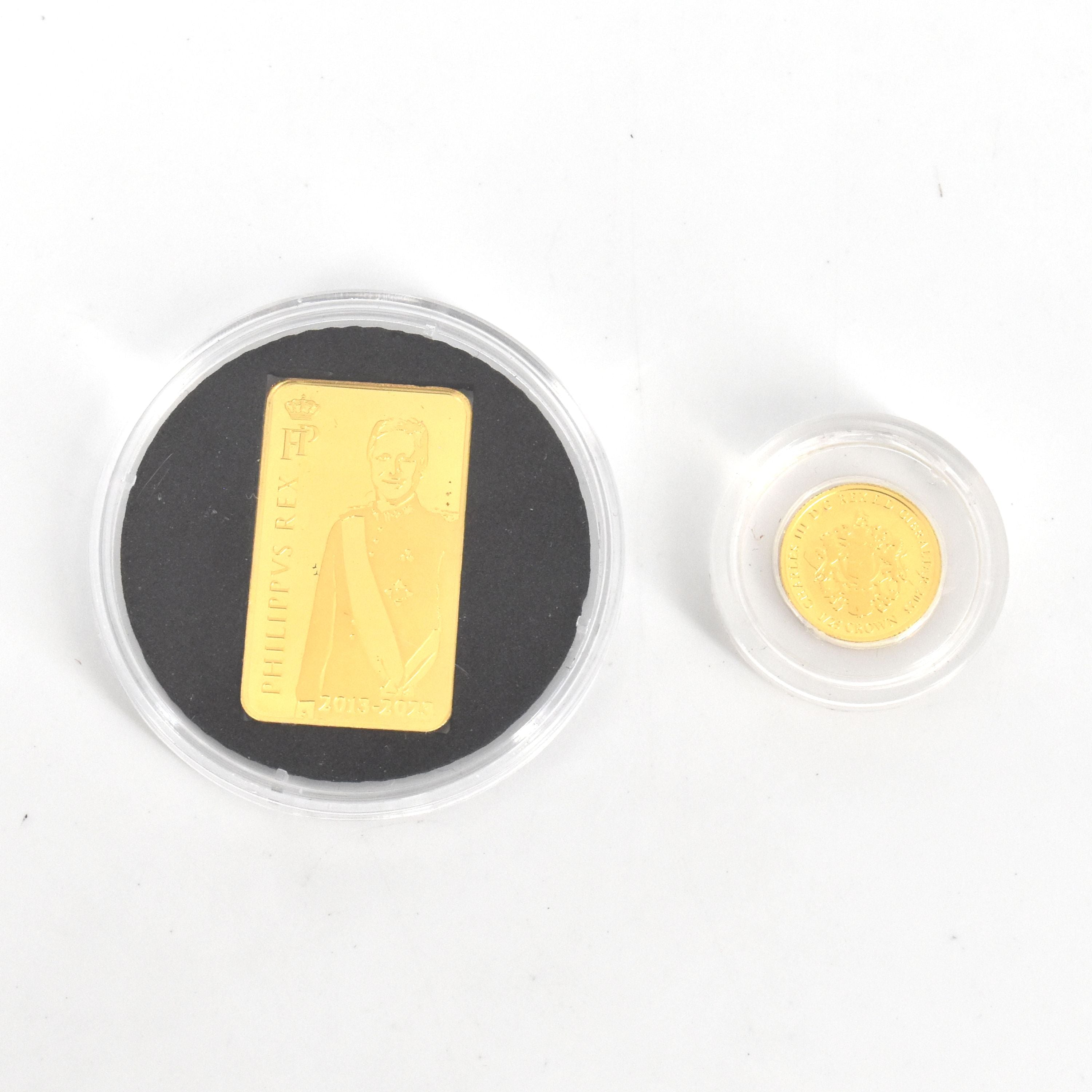 Lingot commémoratif en or jaune 999/1000 (Phillipus Rex-2013/2023-5 dollars-2023) - 2.5 g Pièce de monnaie en or jaune 999/1000 (Gibraltar-Charles III-1/25 crown-2023) - 0.5 g