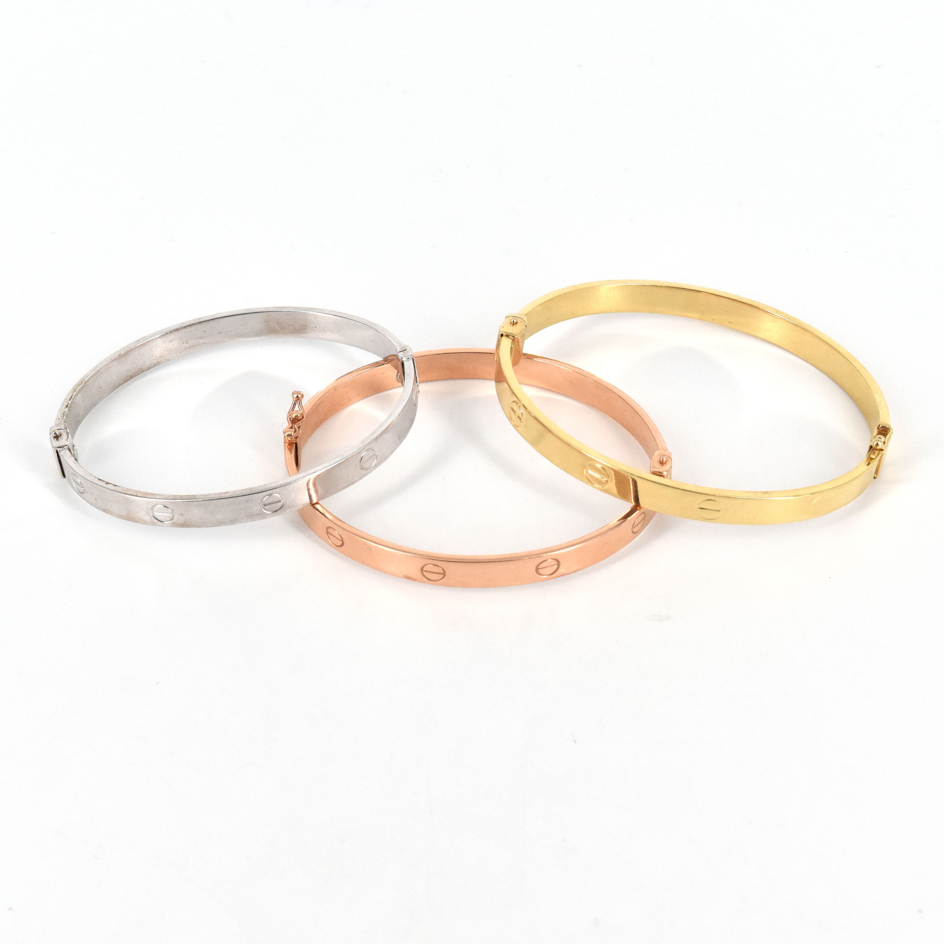 3 bracelets rigides en or 3 couleurs 14 ct (bosselés) - 27.3 g (5.8 x 5 cm x 3)