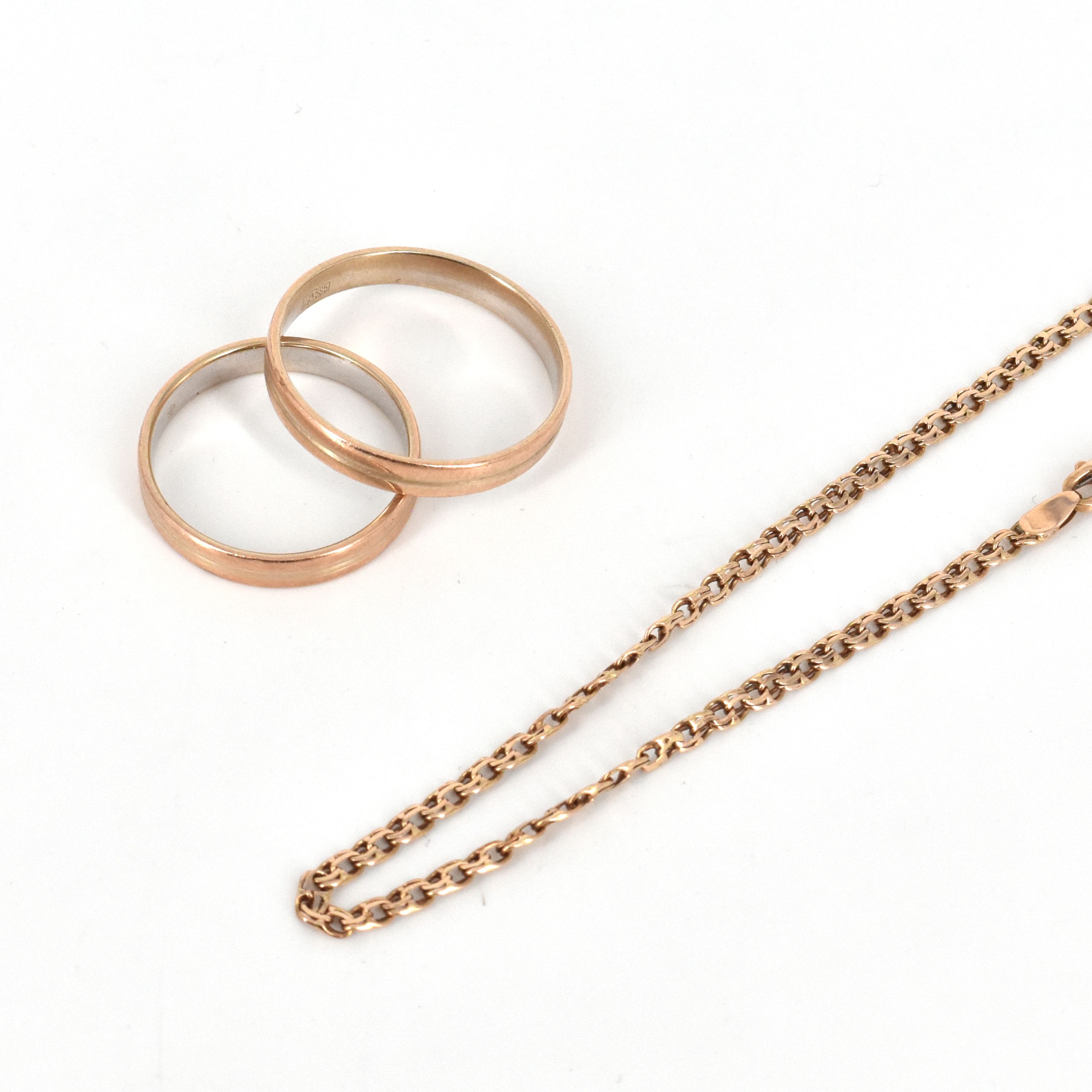 2 alliances et collier en or rose et blanc 14 ct (cassé) - 10.7 g (54 cm)