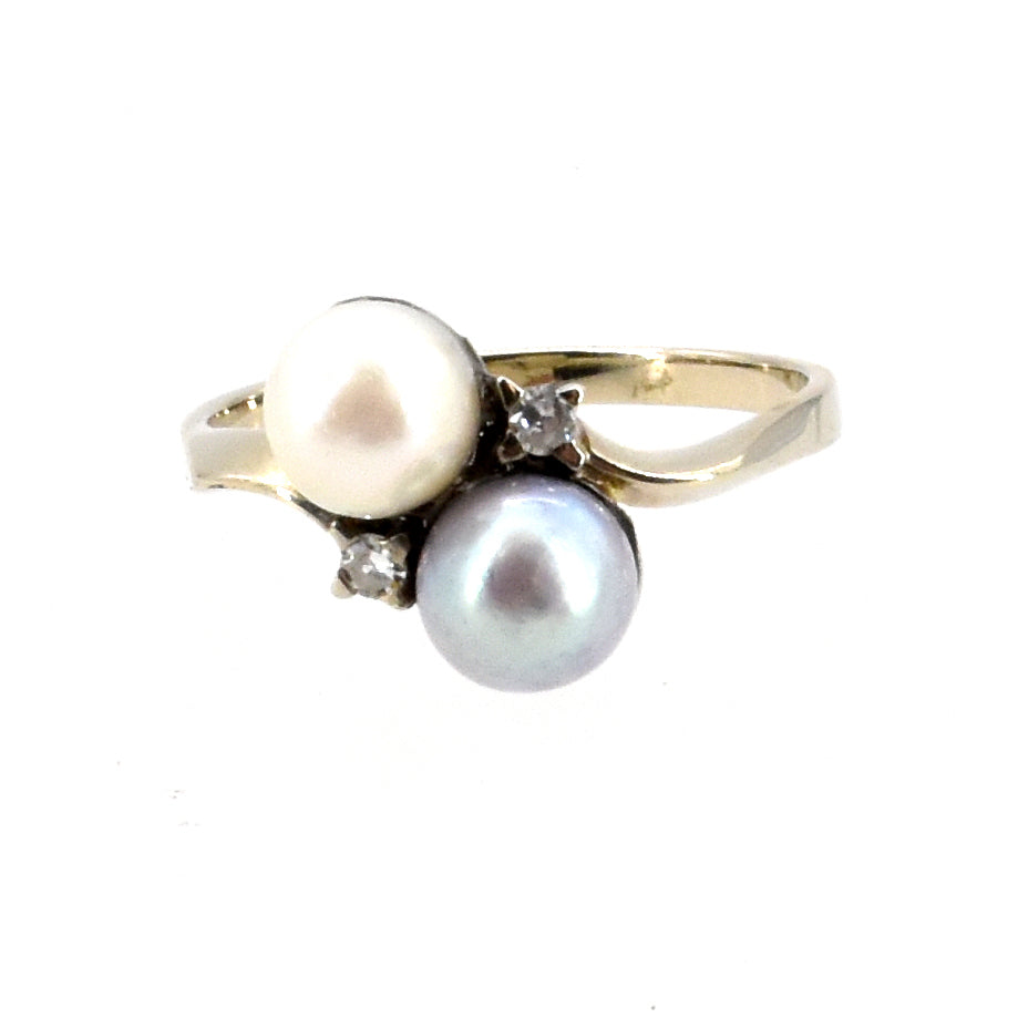 Bague en or blanc 18 ct sertie de 2 diamants taille 8/8 +/- 0.06 ct et 2 perles (+/- 6.5 mm) - 3.9 g brut (Taille: 59)