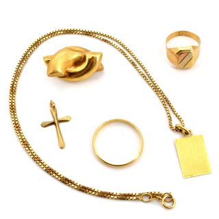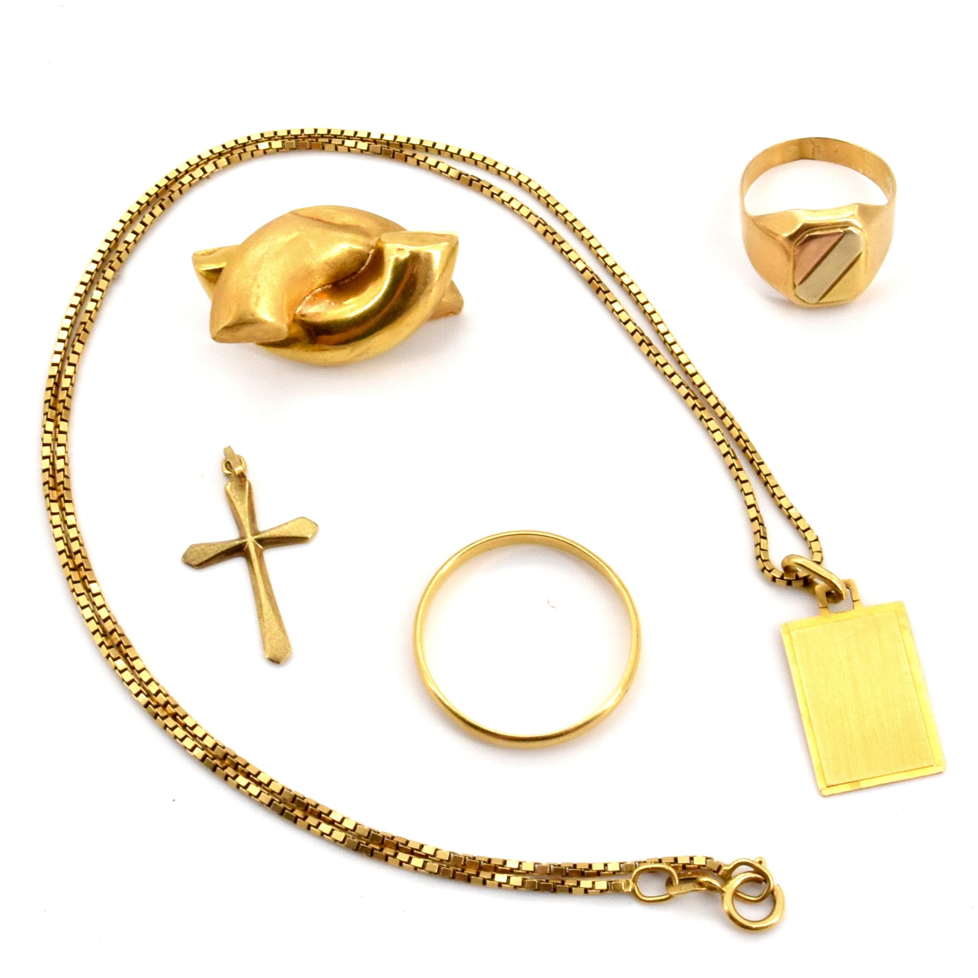 Alliance, bague, collier, pendentif et 1 boucle d'oreille en or 3 couleurs 18 ct (poussette manque, bosselés) - 13.9 g (Tailles: 62 & 51) (44 cm) Croix en or jaune 14 ct - 0.4 g