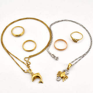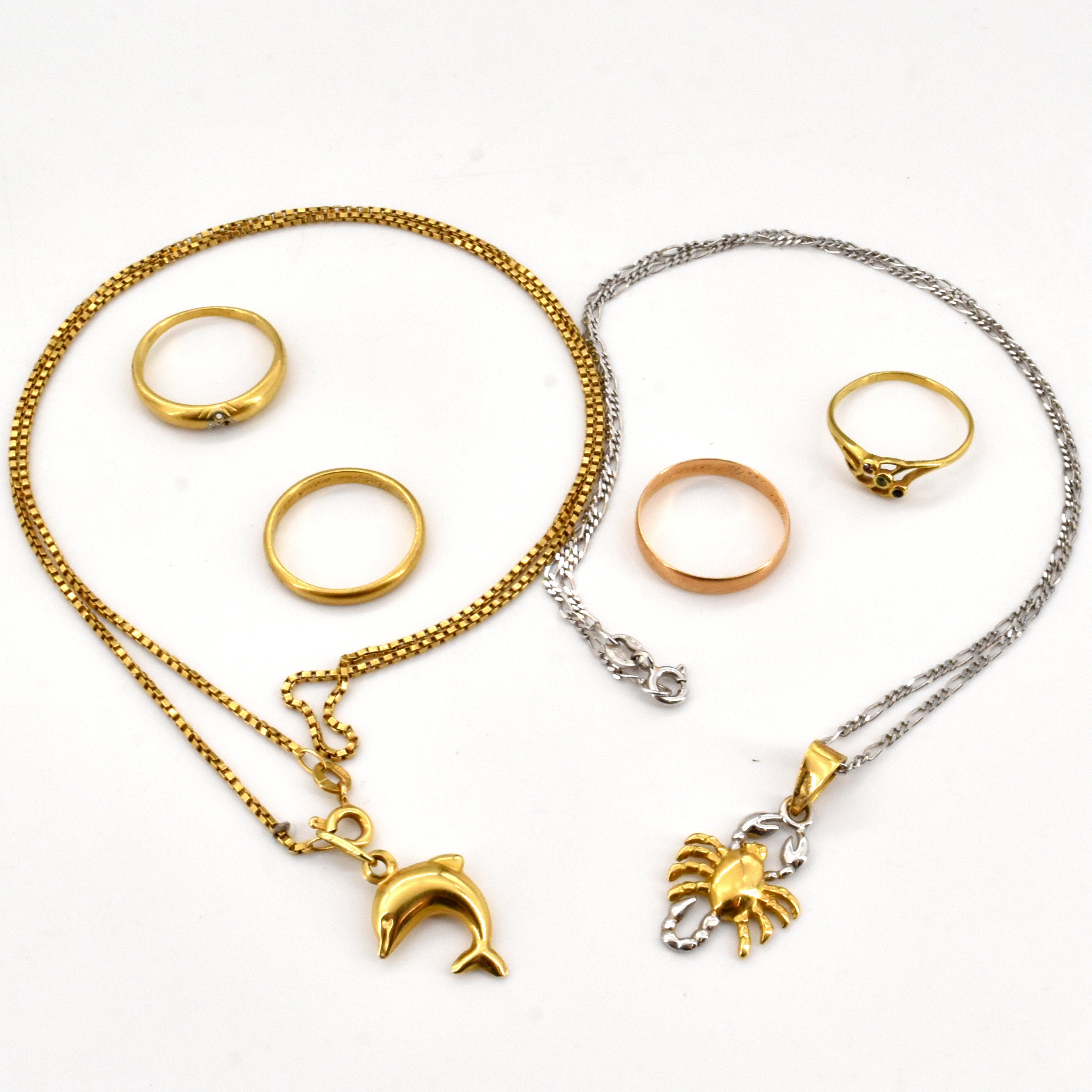 2 alliances, 2 bagues, 2 colliers et 2 pendentifs en or jaune et blanc 18 ct sertie de 4 brillants +/- 0.04 ct (pierres de couleur, pierres manquent, gravées, bosselés) - 19.4 g brut (Tailles: 54 x 3 & 55.5) (52 & 44 cm)