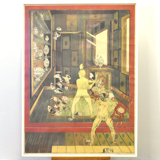 Lithographie portant signature et numéro illisibles: "Scène de combat en intérieur" (affiche pliée, abîmée, légèrement déchirée) (57 x 77 cm)