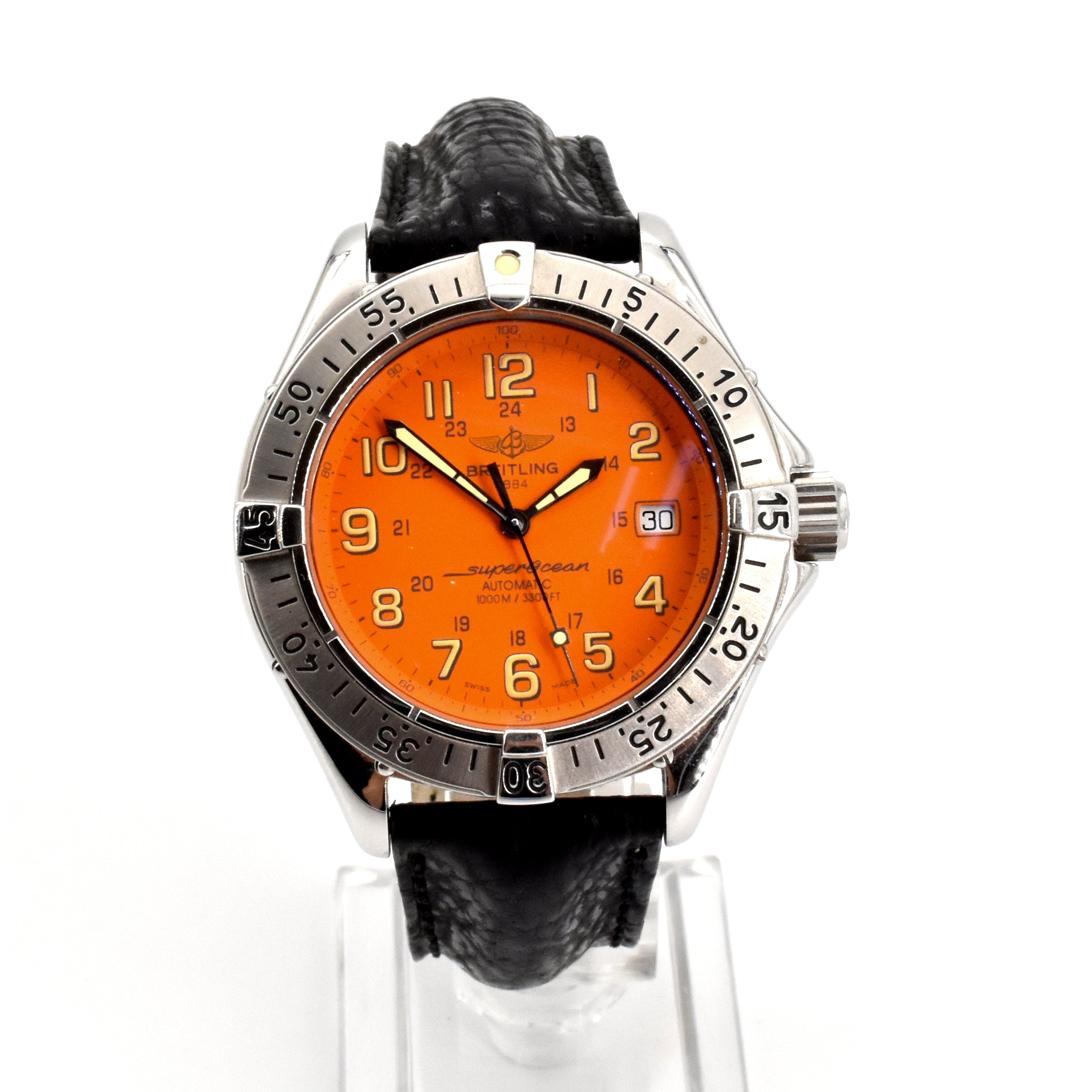 Bracelet-montre homme en acier BREITLING Super Ocean automatique (bracelet en cuir avec boucle en métal, montre n° A17040 17272) + boîte (abîmée)