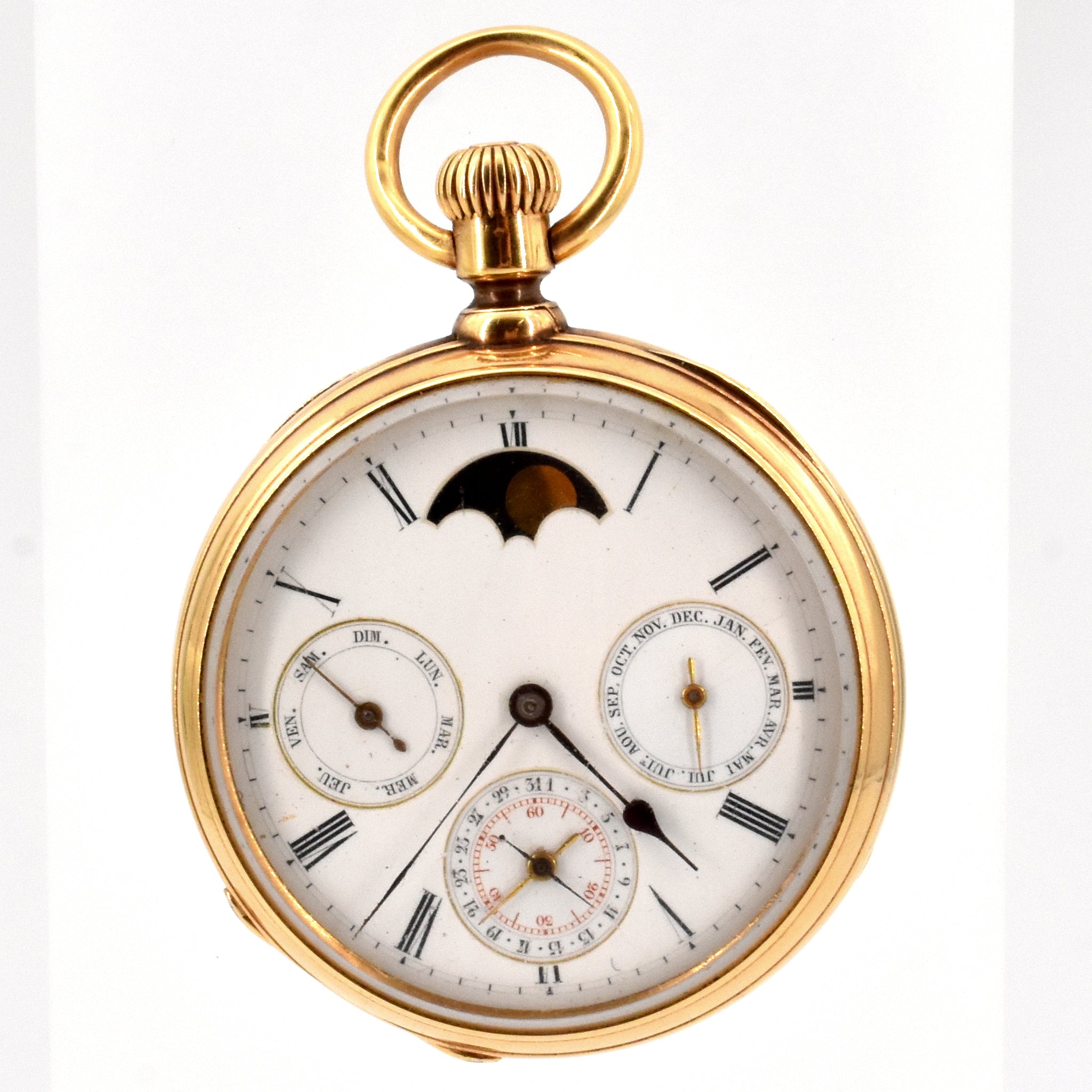 Montre de poche sans marque à 2 cuvettes avec phase de lune en or jaune 18 ct mécanique (1 cuvette porte inscription PATEK PHILIPPE & Co , abîmée, verre abîmé, très légèrement bosselée) - 131.8 g brut