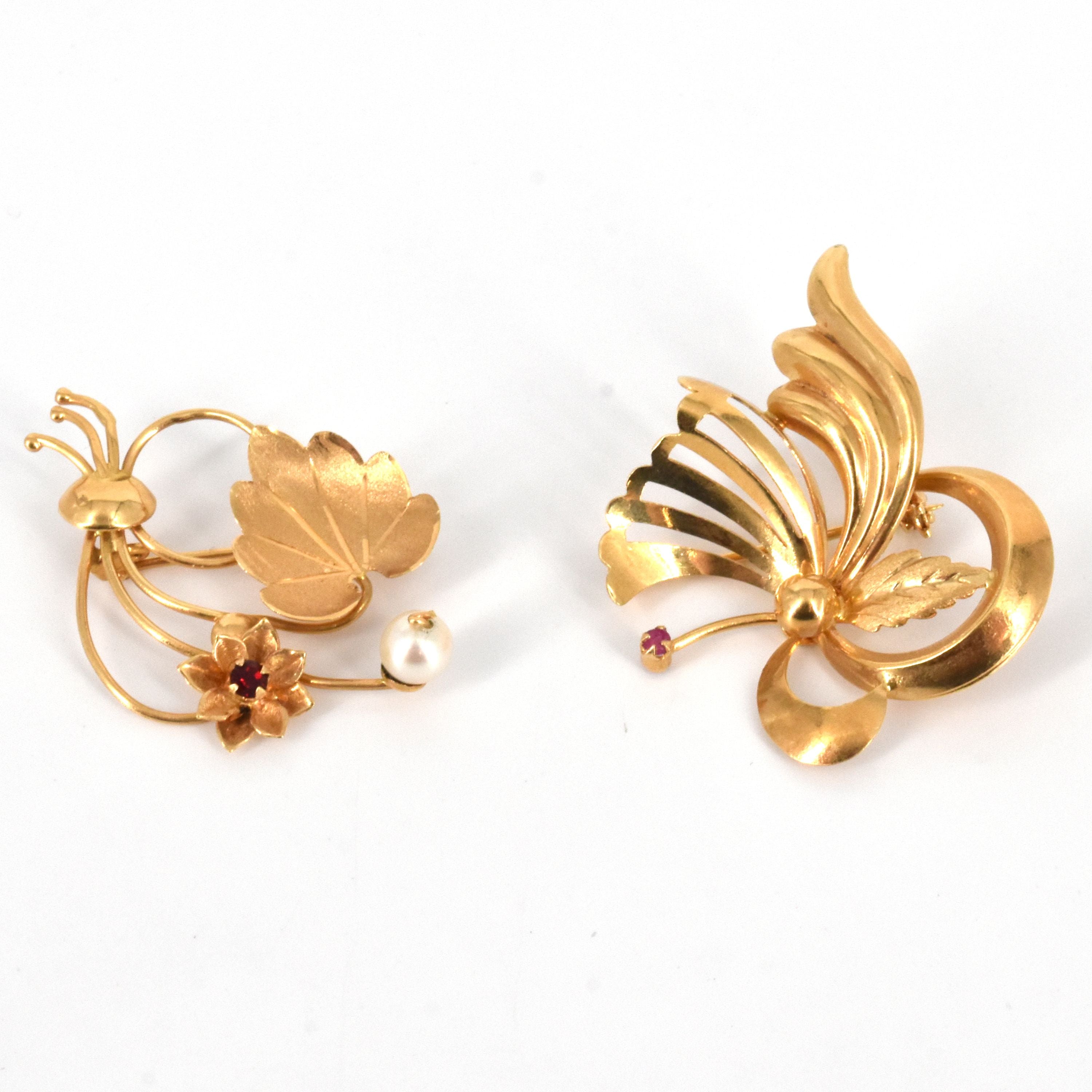 2 broches en or jaune 18 ct (perle, pierres de couleur, bosselé) - 12.4 g