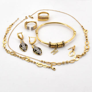 2 bagues, collier, bracelet, bracelet rigide avec breloque attachée et 3 boucles d'oreilles en or jaune et blanc 18 ct (pierres fausses, pierres de couleur, émail, personnalisée, poussette manque, pierres manquent, abîmés,bosselés) - 37.3 g brut (Tailles: 57 & 59) (42 & 18 cm) (6 x 5.5 cm)