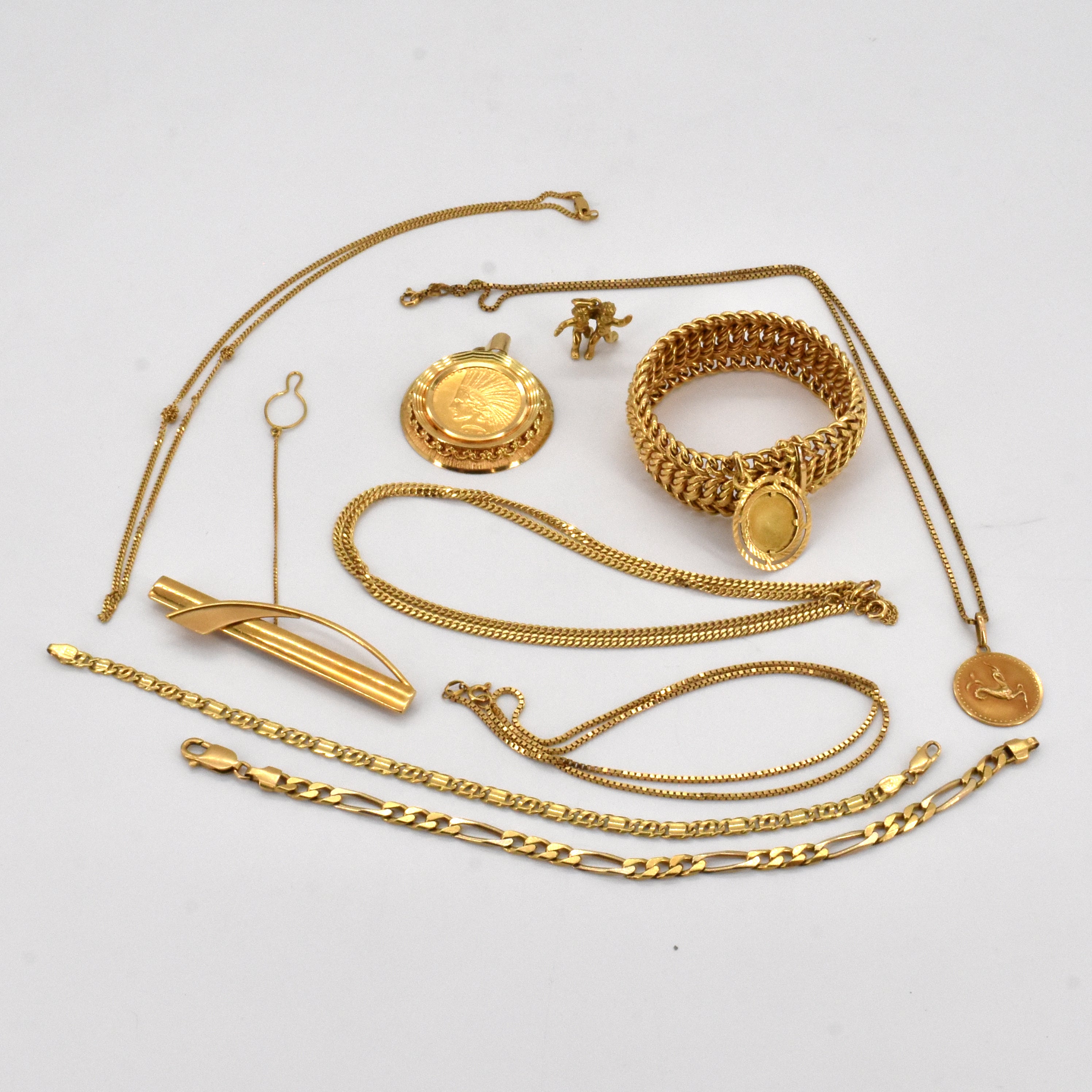4 colliers, 3 pendentifs, 3 bracelets et 1 pince de cravate en or jaune et blanc 18 ct sertie d'1 pièce de monnaie en or jaune 900/1000 (américaine-10$-1910) (chaînette de sûreté, noeuds, bosselés) - 186.2 g (47, 52, 50, 60, 18.5, 21.5 & 23.5 cm)