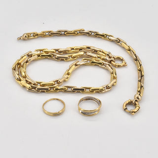 2 bagues, collier et bracelet en or jaune et blanc 18 ct sertie de 3 diamants taille 8/8 +/- 0.01 ct (pierres fausses, abîmés, bosselés) - 37 g (Tailles: 53 & 52.5) (47 & 20.5 cm)