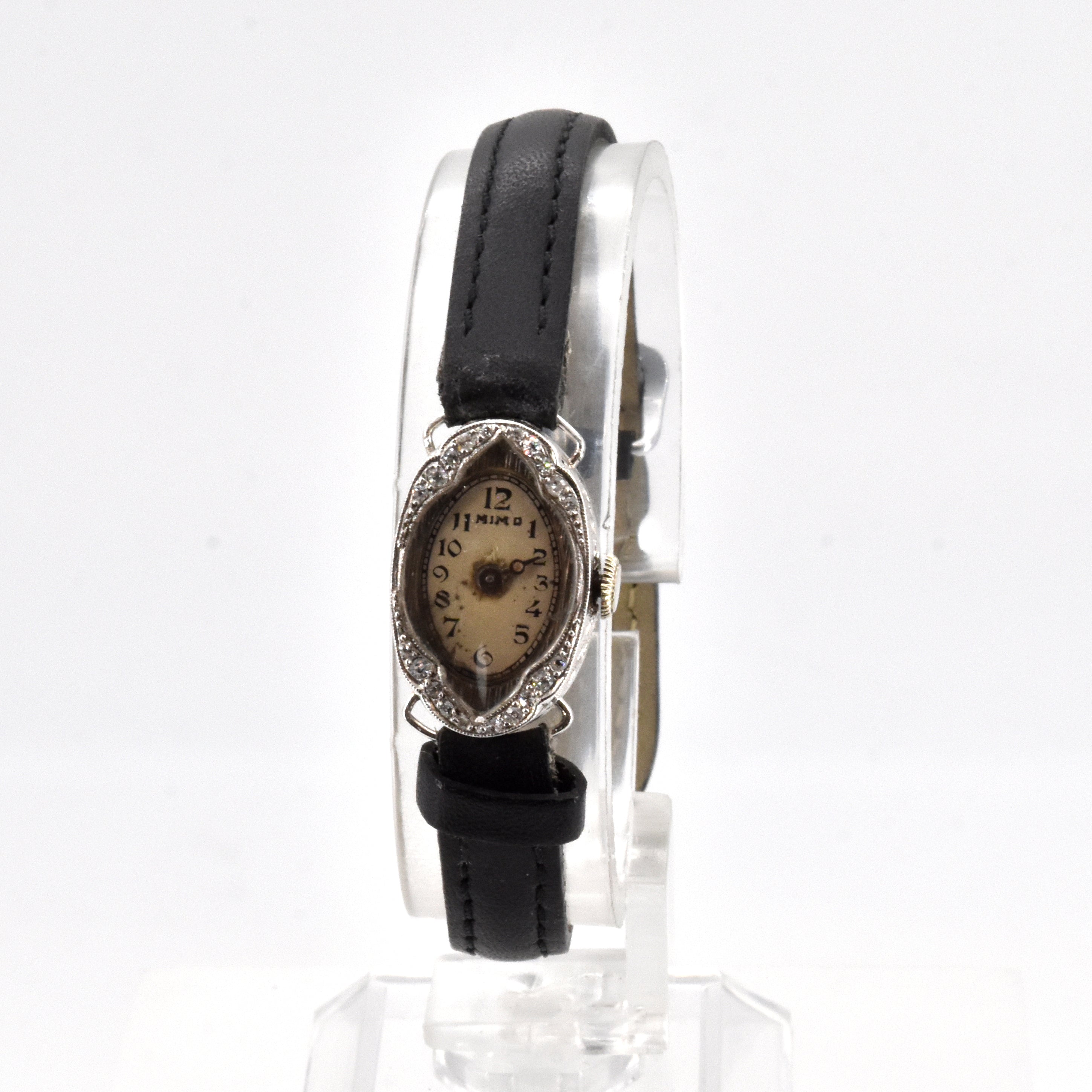 Bracelet-montre dame en platine MIMO mécanique sertie de 20 diamants taille 8/8 et taille ancienne +/- 0.20 ct (bracelet en cuir avec boucle en métal, déréglé, aiguille manque, cadran abîmé, verre abîmé)