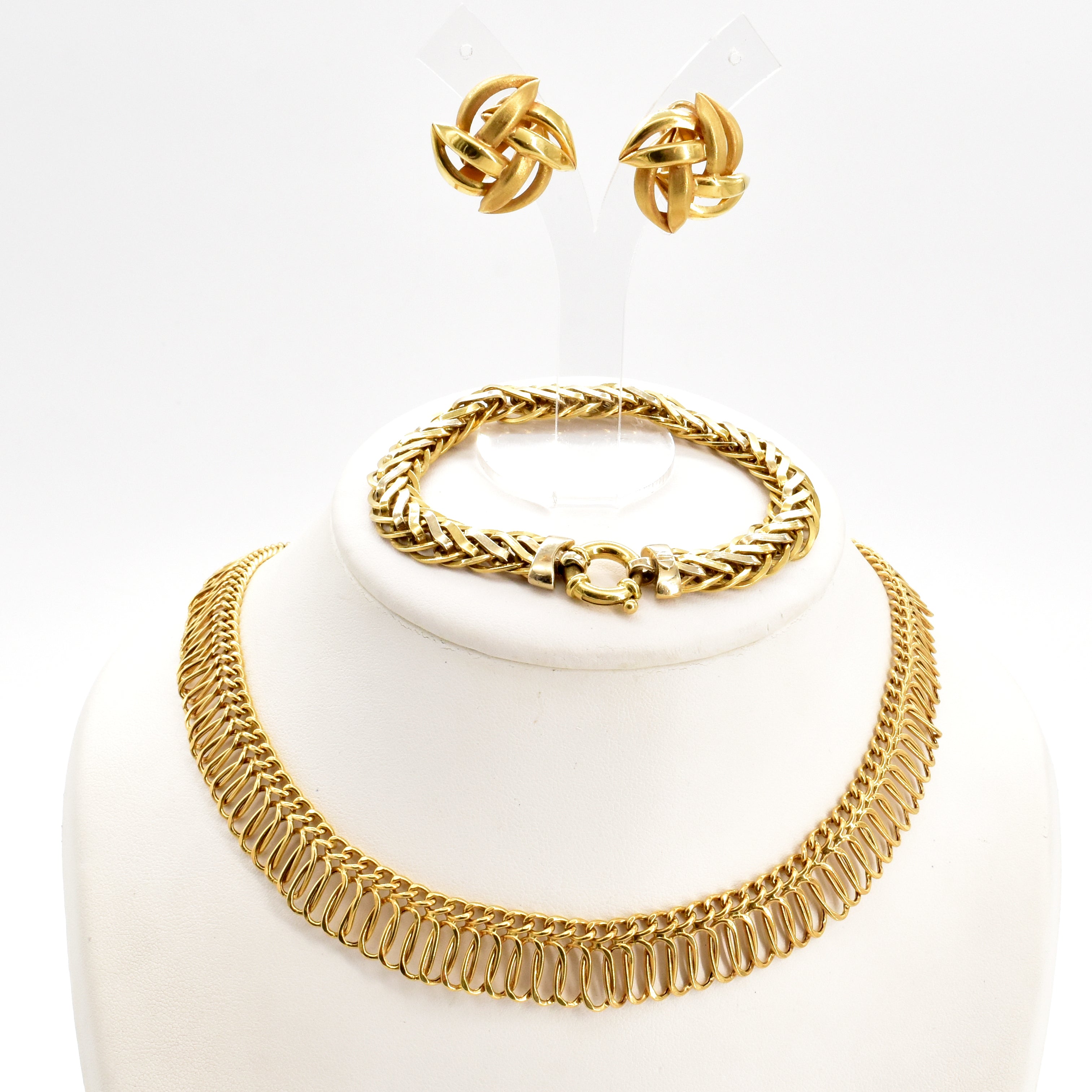 Collier, bracelet et 2 boucles d'oreilles en or jaune et blanc 18 ct (cassé, morceau manque) - 44.5 g (45 x 19.5 cm)