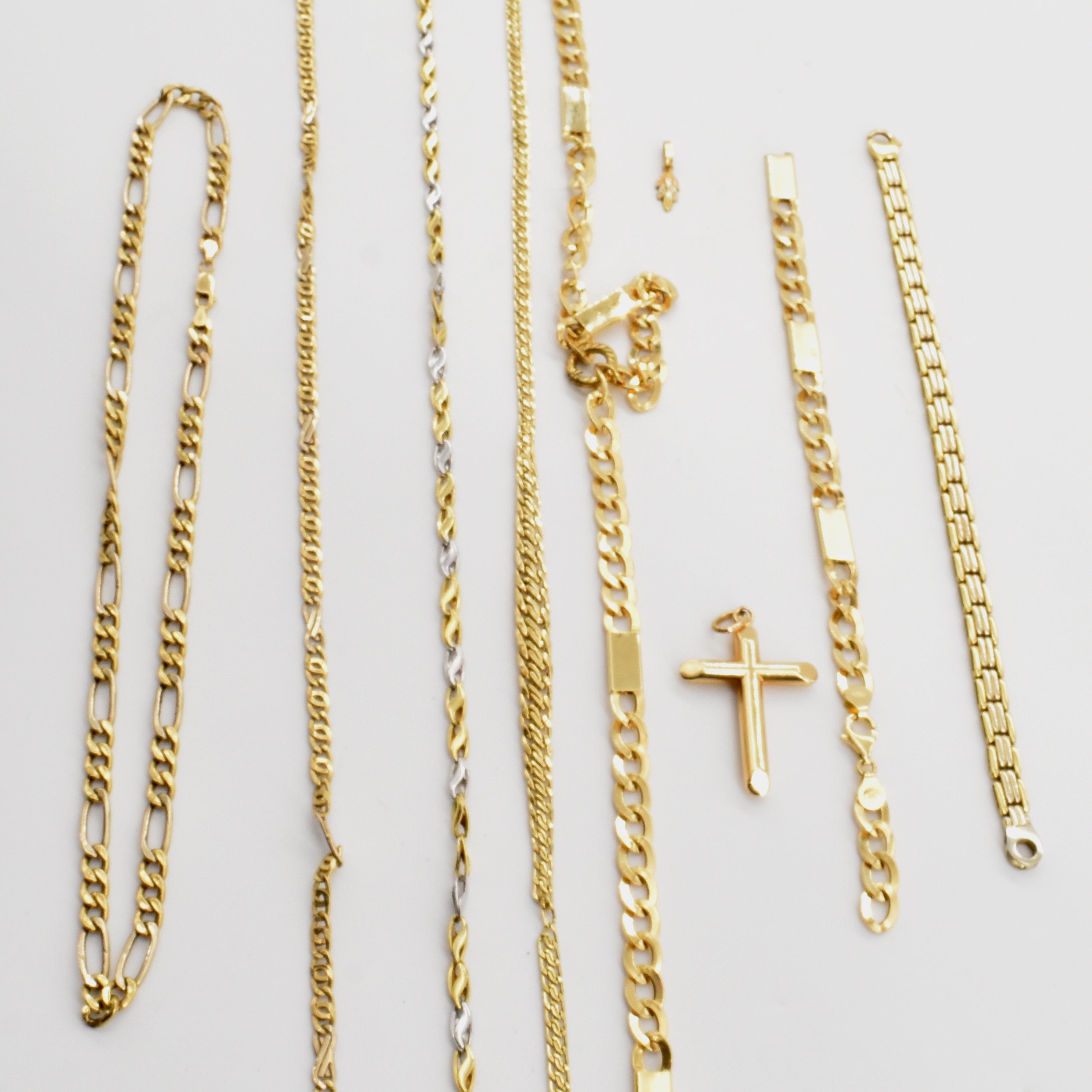 5 colliers, croix, pendentif et 2 bracelets en or jaune et blanc 18 ct (abîmés, bosselés, cassés) - 95.4 g (49.5, 43, 50, 52.5, 57 & 20 cm)